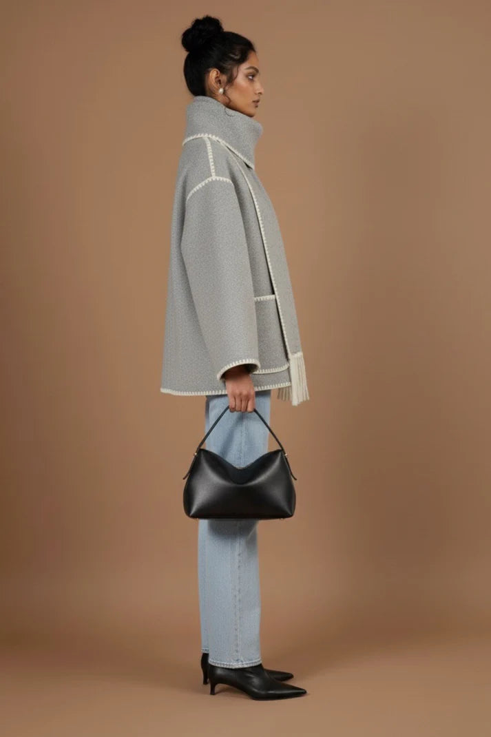 MANDY – Eleganter Mantel mit integriertem Schal Dieser Mantel kombiniert zeitgenössisches Design mit praktischer Funktionalität. Das Oversized-Schnitt-Profil schafft eine moderne Silhouette, während die Kontrastverarbeitung visuelles Interesse erzeugt. Die Snow-Nylon-Mischung bietet strukturierte Haptik und Bewegungsfreiheit für alltägliche Tragekomfort. Der markante hohe Kragen mit integriertem Schal eliminiert die Notwendigkeit zusätzlicher Accessoires und optimiert die Wärmeisolation in der kälteren Jahreszeit. Ein durchdachtes Kleidungsstück für anspruchsvolle Garderobe-Zusammenstellung.